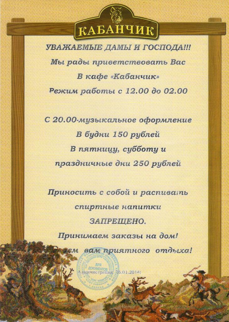 Кафе «Кабанчик» открыто несколько лет назад. Основой меню являются блюда из мяса. Также у нас большой ассортимент блюд из рыбы и птицы, европейской кухни в целом.